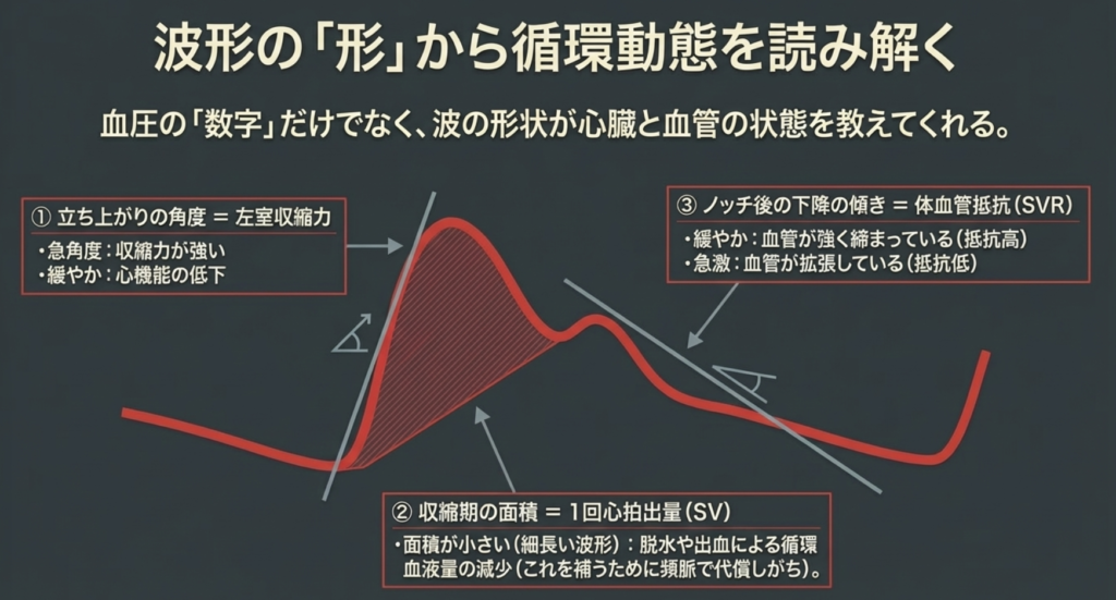 - 持続的血圧モニタリング:心拍ごとの急激な血圧変動をリアルタイムに捉えることができます。マンシェットでの測定では数分ごとの間隔が空いてしまいますが、Aラインなら瞬時の変化を見逃しません。