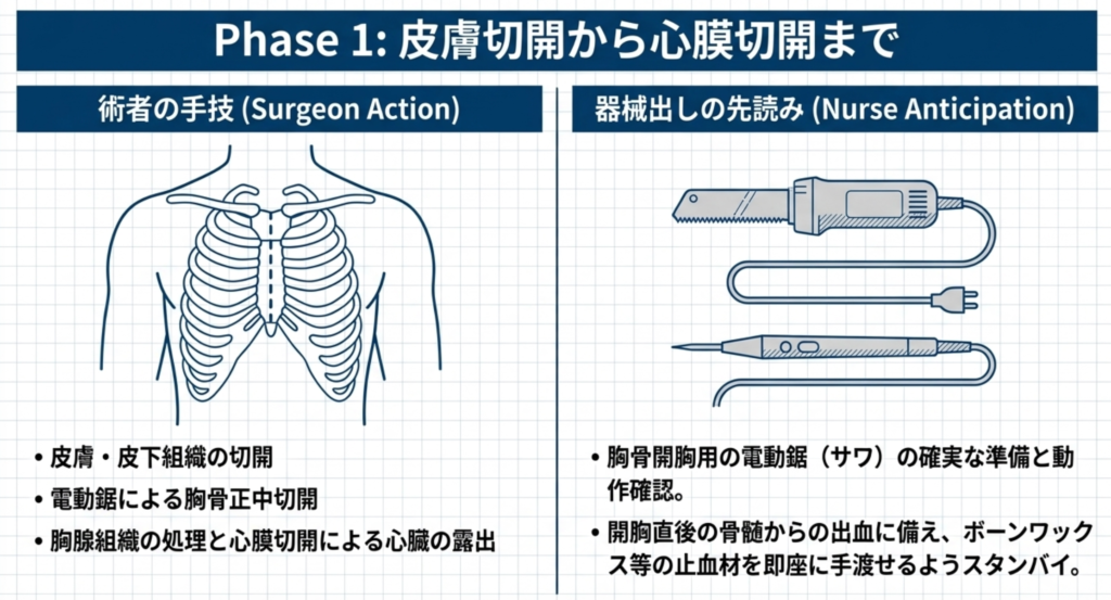 ・人工心肺導入前後の流れ把握 ・吻合ごとの器械準備 ・冠動脈再建時の迅速対応 |