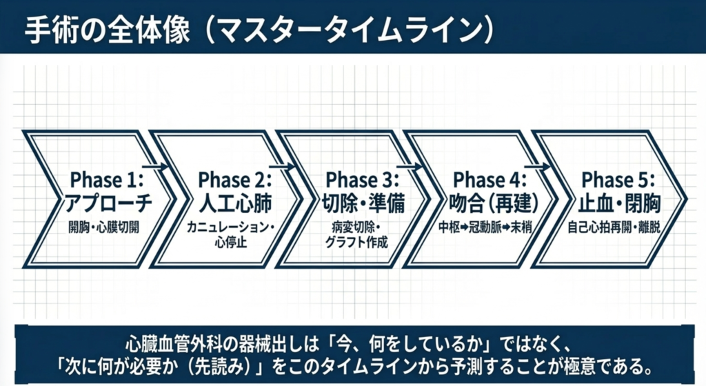 ① 開胸・人工心肺開始 ② 大動脈遮断・心停止 ③ 大動脈基部切除 ④ 冠動脈ボタン作成 ⑤ グラフト縫着 ⑥ 冠動脈再建 ⑦ 末梢側吻合 |