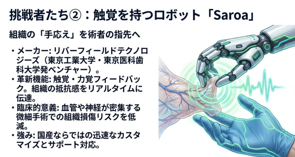 さらに注目されているのが、リバーフィールドテクノロジーズ社の「Saroa(サロア)」です。Saroaは、鉗子操作時の触覚・力覚フィードバックを術者に伝える機能を備えており、組織の“手応え”を感じながら操作できる点が特徴です。血管や神経が密集する場面での安全性向上が期待されています。