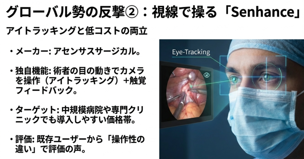 また、「Senhance(センハンス)」は、視線でカメラを操作できるアイトラッキング機能や、触覚フィードバックを備えた独自性の高いシステムです。比較的コンパクトで価格帯も抑えめなため、中規模病院での導入が進んでいます。