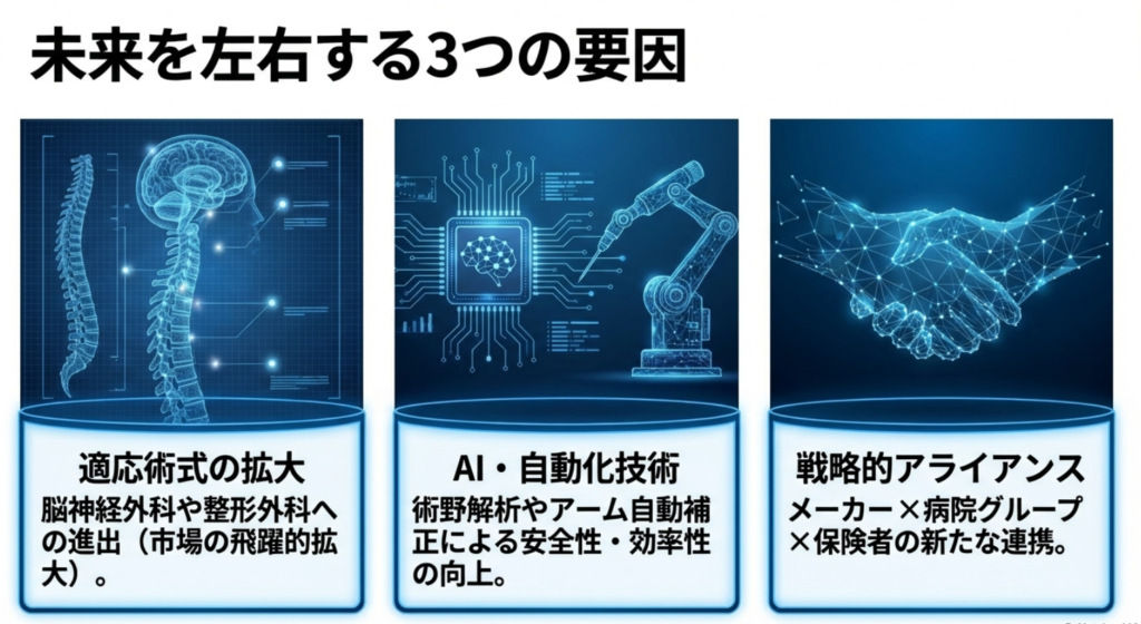 メーカーによるデモや試験導入が行われるケースも増え、ロボット手術市場はまさに過渡期にあります。この競争は、ダヴィンチ側にとっても改良や新モデル開発の原動力となり、市場全体の技術進化を加速させています。