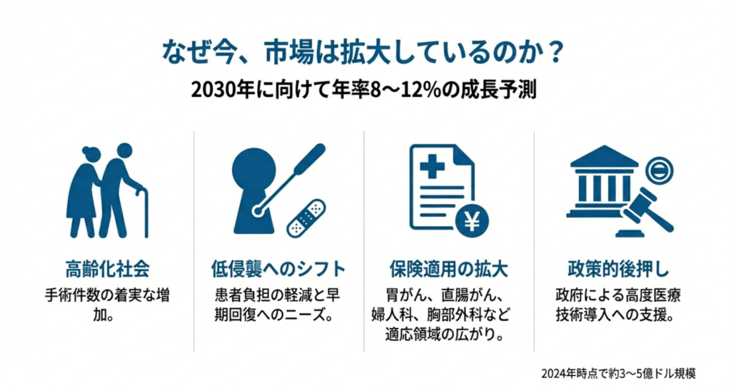 まず、高齢化に伴う手術件数の増加。次に、患者さんの負担を減らし、回復を早める低侵襲手術への強いニーズです。さらに、ロボット手術の保険適用が徐々に拡大していることや、国として高度医療技術の導入を後押ししている点も大きな要因です。