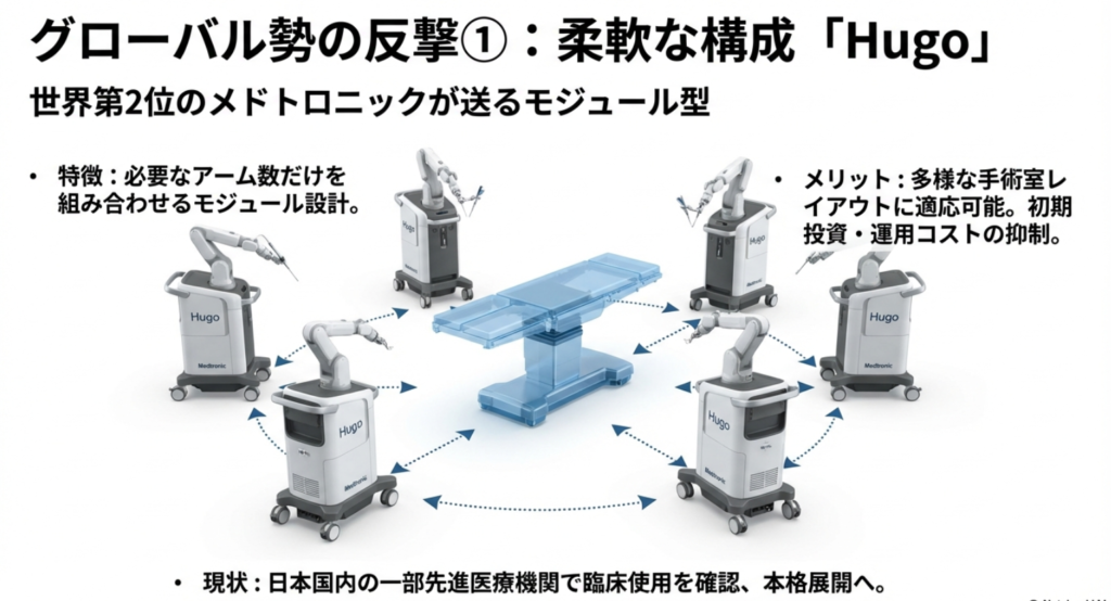 メドトロニック社の「Hugo RAS System」は、必要なアーム数を組み合わせて使えるモジュール型設計が特徴です。初期費用や運用コストを抑えやすく、手術室のレイアウトに柔軟に対応できる点が評価されています。