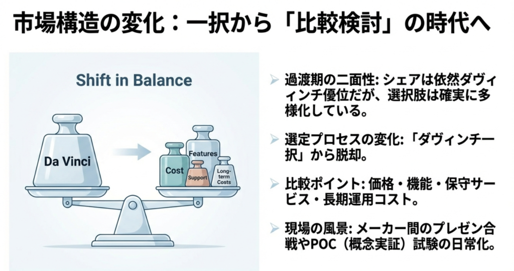 現時点では、導入台数や症例数でダヴィンチが優位である状況は変わっていません。ただし、国産・海外の競合機が増えたことで、病院側は価格、機能、サポート体制、長期的な運用コストを比較するようになっています。