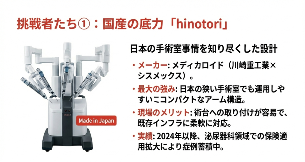 2020年に発売された、メディカロイド社の「hinotori(ヒノトリ)」は、日本初の本格的なダヴィンチの競合機として注目を集めています。