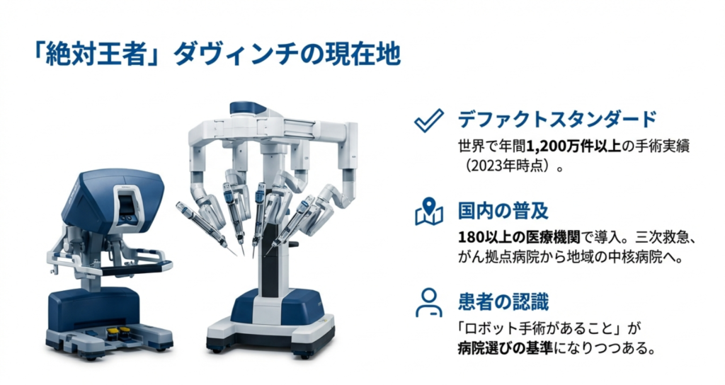 多くの手術室で“特別な装置”から“標準設備”へと位置づけが変わったダヴィンチ。その普及は、日本の外科医療の風景を確実に変えています。