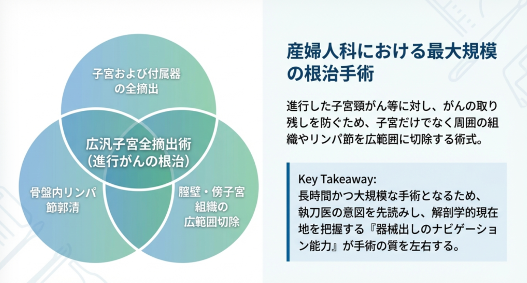 | 広汎子宮全摘出術 (Radical) | 子宮、基靭帯を骨盤壁の根本から切断、大きく膣壁(3〜4cm以上)を切除。骨盤リンパ節郭清を伴う。 | 子宮頸がん(進行期Ⅰb期〜Ⅱa期など) | 大規模。尿管の完全剥離や排尿神経の温存/犠牲など難易度が高い。 |