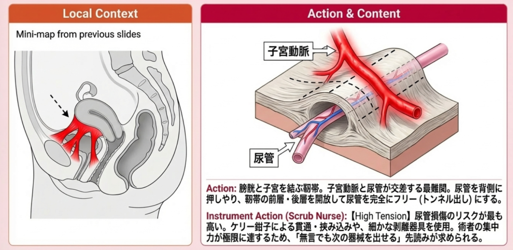 広汎手術の特徴は、「尿管」と「子宮動脈・静脈」の交差部(Water under the bridge)を完全に分離しなければならない点です。ここを傷つけると重大な合併症(尿管損傷など)に直結します。