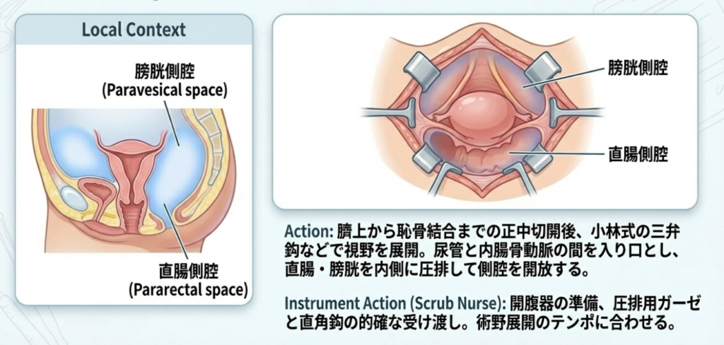器械出し看護師にとって、この手術は「今、どこの靭帯を切っているのか」「この血管は尿管の上か下か」といった三次元の解剖図が頭に入っているかを試される究極の婦人科手術です。