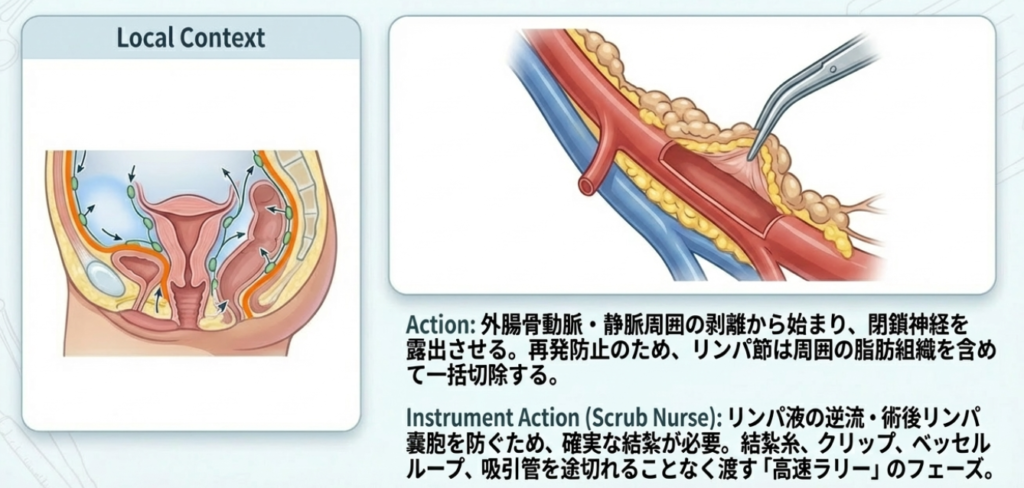 - リンパの除去:総腸骨動脈、内外腸骨動・静脈、閉鎖神経周囲の脂肪・リンパ組織をごっそりと取り除きます。
