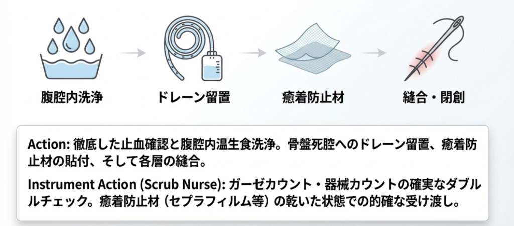 - 徹底的な止血確認とドレーン留置:骨盤の底全体がえぐり取られたような状態になるため、洗浄を行い、じわじわとした出血がないか確認します。滲出液やリンパ液を排出するためのドレーン(J-VACやペンローズ等)を留置します。