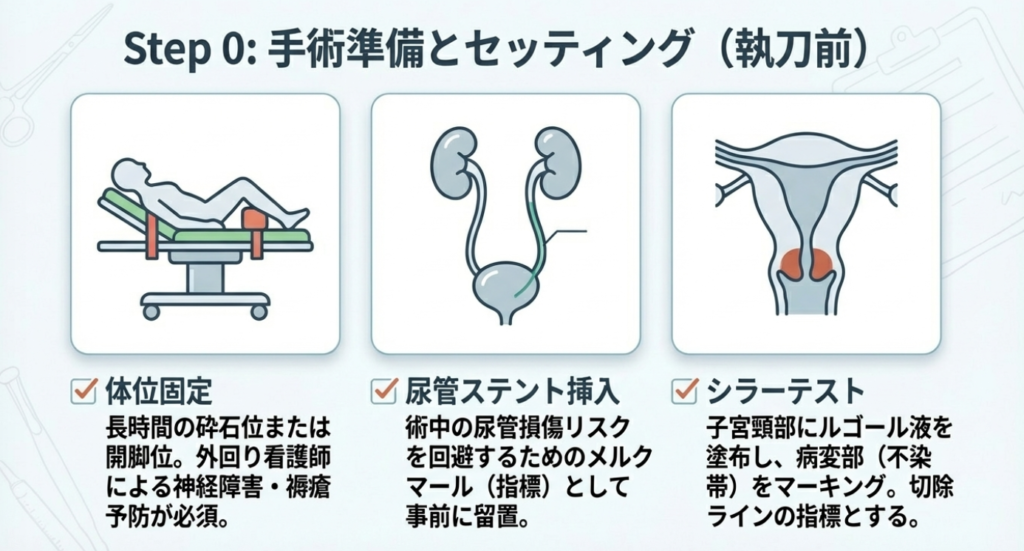 - 出血リスクへの備え:広汎手術では通常、500ml〜1000ml以上の出血が予想されます。交差適合試験(クロスマッチ)の完了確認、自己血や同種血輸血のルート確保(太い静脈ライン・中心静脈カテーテル等)が外回りの最優先タスクです。