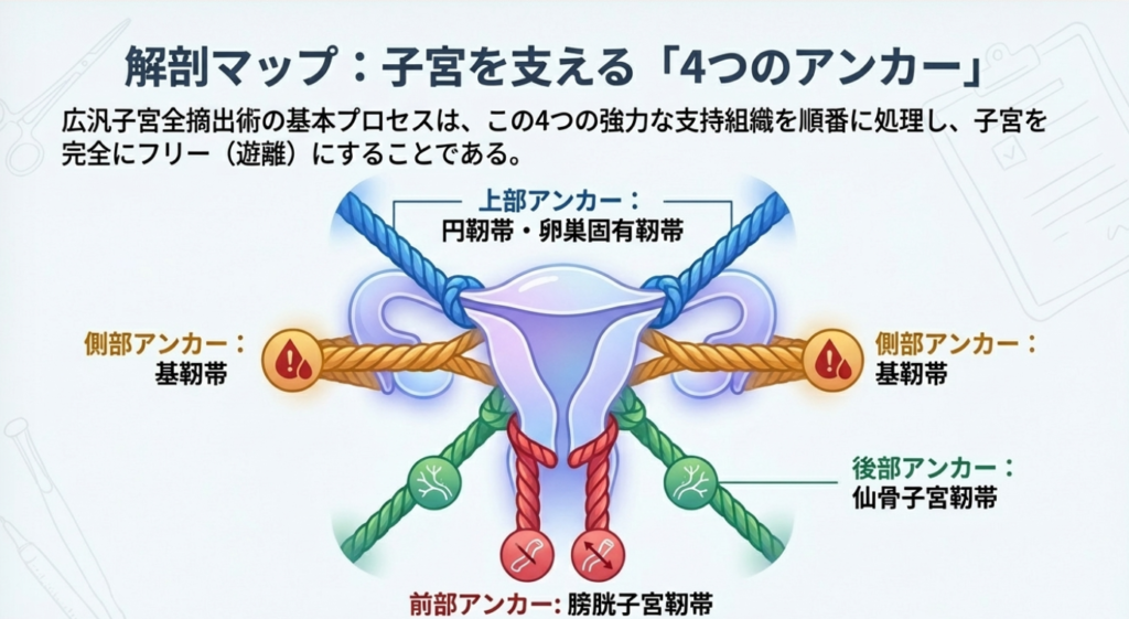 また、子宮を支えている4つの重要な靭帯(円靭帯、骨盤漏斗靭帯、仙骨子宮靭帯、基靭帯)をすべて切断しなければ、広範な摘出は実現できません。この解剖をイメージできることが器械出しの生命線です。
