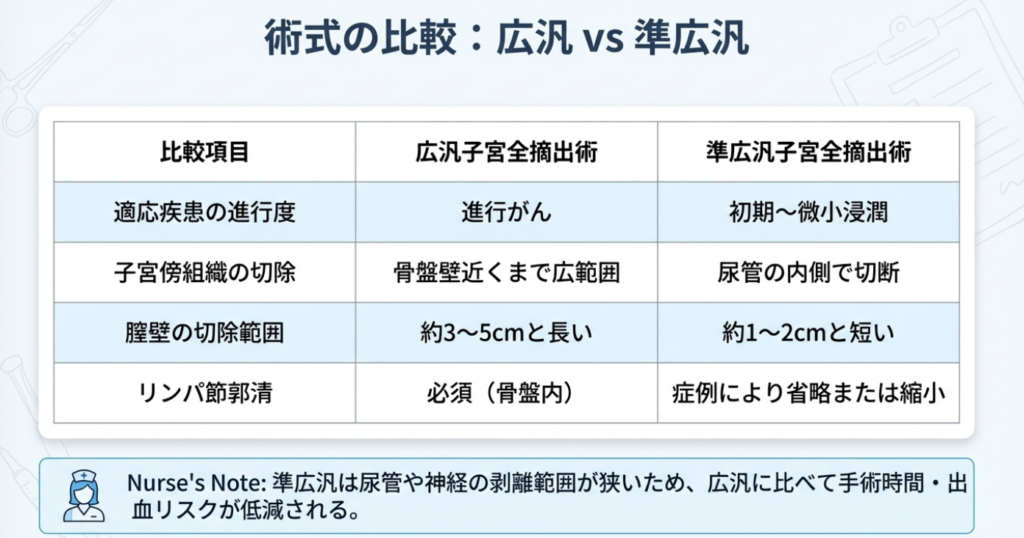 婦人科の子宮摘出術には、切除する範囲によって主に3つのレベルがあります。これが分かれば、なぜ今回「広汎」なのかがスッと理解できます。