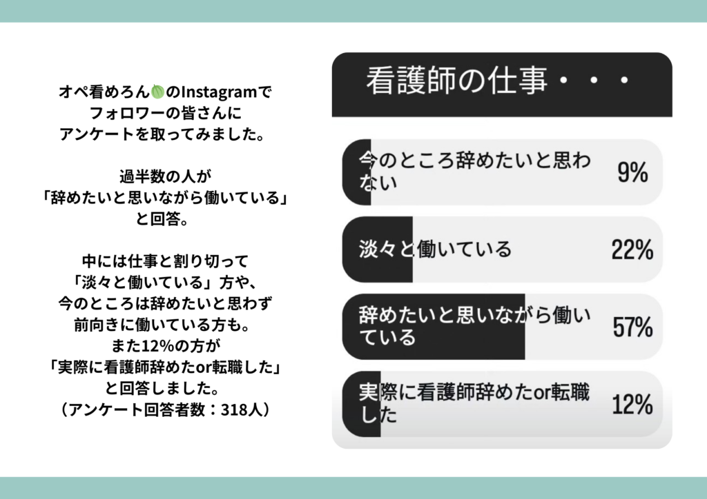 インスタグラムのストーリーズで「看護師の仕事について」アンケートをとったところ、318人中57%が「辞めたいと思いながら働いている」と回答しました。つまり、辞めたいと感じるのは特別なことでも、弱さでもありません。むしろ、誰もが一度は抱く“普通の感情”です。