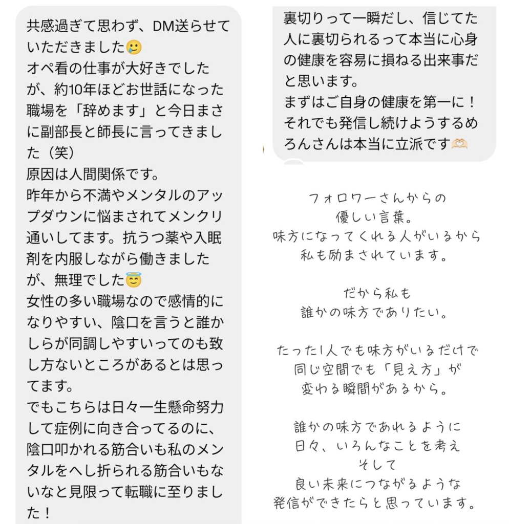 またオペ看めろんInstagramのDMやコメント欄にて個別に以下のようなメッセージも届きました。皆さんいつも本当にありがとうございます。(※DM掲載許可は得ています)