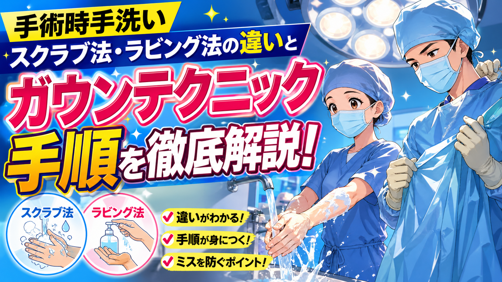 【完全版】手術時手洗い(スクラブ法・ラビング法の違い)とガウンテクニック手順を徹底解説